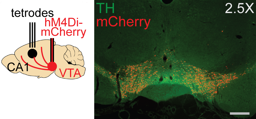 By combining high density tetrode recordings in hippocampal area CA1 and reversible inactivation of dopamine neurons, I showed normal reward-related dopamine signaling is necessary for replay sequences to be targeted to newly discovered, highly rewarding locations. Tetrodes recorded from the CA1 region of hippocampus (left panel), while dopamine neurons in the VTA, visualized here in green by staining for the enzyme tyrosine hydroxylase (TH), expressed the inhibitory DREADD hM4Di, visualized here in red by co-expression of mCherry (right panel). Adapted from Kleinman MR, Foster DJ. Spatial localization of hippocampal replay requires dopamine signaling. Elife. 2025 Mar 24;13:RP99678. doi: 10.7554/eLife.99678.