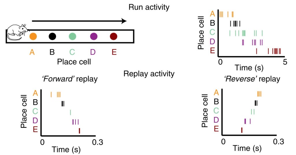 The sequences of neuronal activations observed during active exploration of an environment are recapitulated during stationary or rest periods in temporally compressed, and sometimes reversed, order. Tick marks indicate action potentials fired by a given neuron. Adapted from Ólafsdóttir HF, Bush D, Barry C. The Role of Hippocampal Replay in Memory and Planning. Curr Biol. 2018 Jan 8;28(1):R37-R50. doi: 10.1016/j.cub.2017.10.073.