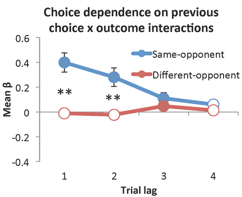 Human participants played a binary choice “matching pennies” game against two distinct simulated opponents. Participants were tasked with predicting whether their opponent would choose heads or tails and themselves picking the same, while the simulated opponents used independent reinforcement learning algorithms with a four-trial memory to predict the participant’s next decision and choose the opposite. As evidenced by opponent-specific choice dependence, participants treated the two opponents independently, and neural activity related to rewards was similarly strongly dependent on opponent. Adapted from Vickery TJ, Kleinman MR, Chun MM, Lee D. Opponent Identity Influences Value Learning in Simple Games. J Neurosci. 2015 Aug 5;35(31):11133-43. doi: 10.1523/JNEUROSCI.3530-14.2015.