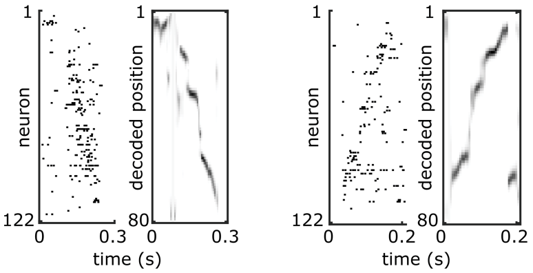 Example replay sequences showing “jump” and “drift” dynamics. Neurons are ordered according to their preferred firing location on the track. Tick marks indicate action potentials fired by a given neuron. The spatial position represented by the ensemble of neurons in each time bin is determined using Bayesian decoding.