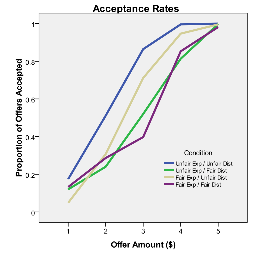 Participants completed trials of the “ultimatum game” against fictitious opponents, in which the opponent offered the participant $1 to $5 of a $10 endowment, and the participant either accepted the offer and received the offered amount, or rejected the offer and caused both players to receive $0. The instructions included a line that primed participants to expect more fair offers (“Fair Exp”) or more unfair offers (“Unfair Exp”), then participants experienced a distribution of offers that included more $4-5 fair offers (“Fair Dist”) or more $1-2 unfair offers (“Unfair Dist”). The 2×2 design revealed both the expectation and experience of fairness influences decisions in this game, demonstrated most strongly by participant responses to $3 offers that were equally common in all conditions.