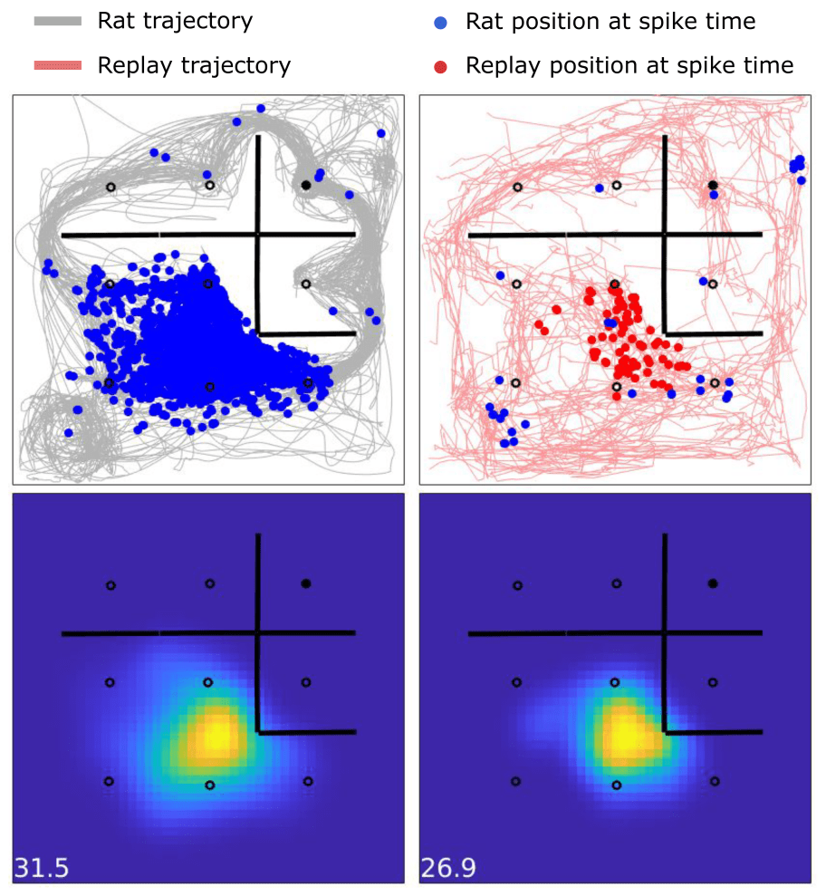 The selectivity of hippocampal place cells is preserved across actual and simulated experience. The activity of one individual hippocampal place cell in a 1 meter by 1 meter arena is shown across two different behavioral states, when the animal is actively exploring the environment (left) and when the animal is stationary but hippocampal replay sequences are exploring the environment (right). The heatmaps on the bottom show firing rates across position, with the peak rate indicated (bottom left). The preferred location, peak firing rates, and variability in firing rates across repeated passes through the environment are similar, suggesting the same mechanisms and statistics are driving learning in online and offline states.