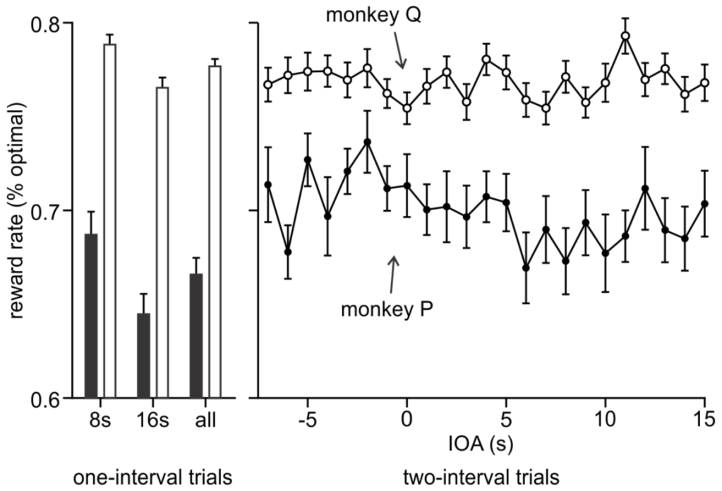 In a concurrent interval timing task, monkeys were able to flexibly and accurately time multiple long temporal intervals. When only one interval was presented (left), subjects more accurately timed the shorter 8-s interval than the longer 16-s interval, reflected by an obtained reward rate closer to optimal. In two-interval trials (right), the 8-s and 16-s onset times were randomly varied between an interval onset asynchrony (IOA) of -7 s (8-s interval appeared 7 s before the 16-s interval) to +15 s (8-s interval appeared 15 s after the 16-s interval). Subjects maintained similarly high reward rates as in one-interval trials, despite having to flexibly track both 8-s and 16-s intervals.