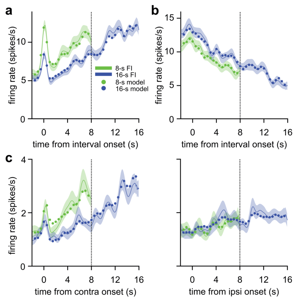 Neurons in dorsomedial prefrontal cortex encoded elapsed time through ramping changes in firing rate. Animals tracked 8-s and 16-s fixed interval targets, indicating with eye movement choices when they had judged at least 8 or 16 s had passed, respectively, since the target onset. Even while animals withheld behavioral responses, neurons showed timing-related ramping activity. Some neurons ramped irrespective of spatial position (a and b), while others selectively timed for particular target positions in visual space (c; contralateral and ipsilateral indicates position of target in visual field relative to the hemisphere of neural recording). An autoregressive time series generalized linear model fitting neural activity to sensory, motor, reward, and timing variables provided a good fit to neural data (circles).